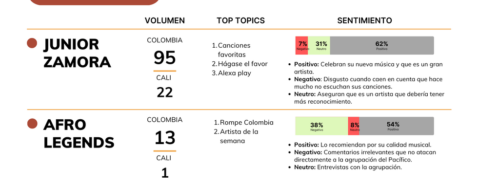 Volumen de conversación sobre artistas en Colombia y específicamente en Cali.